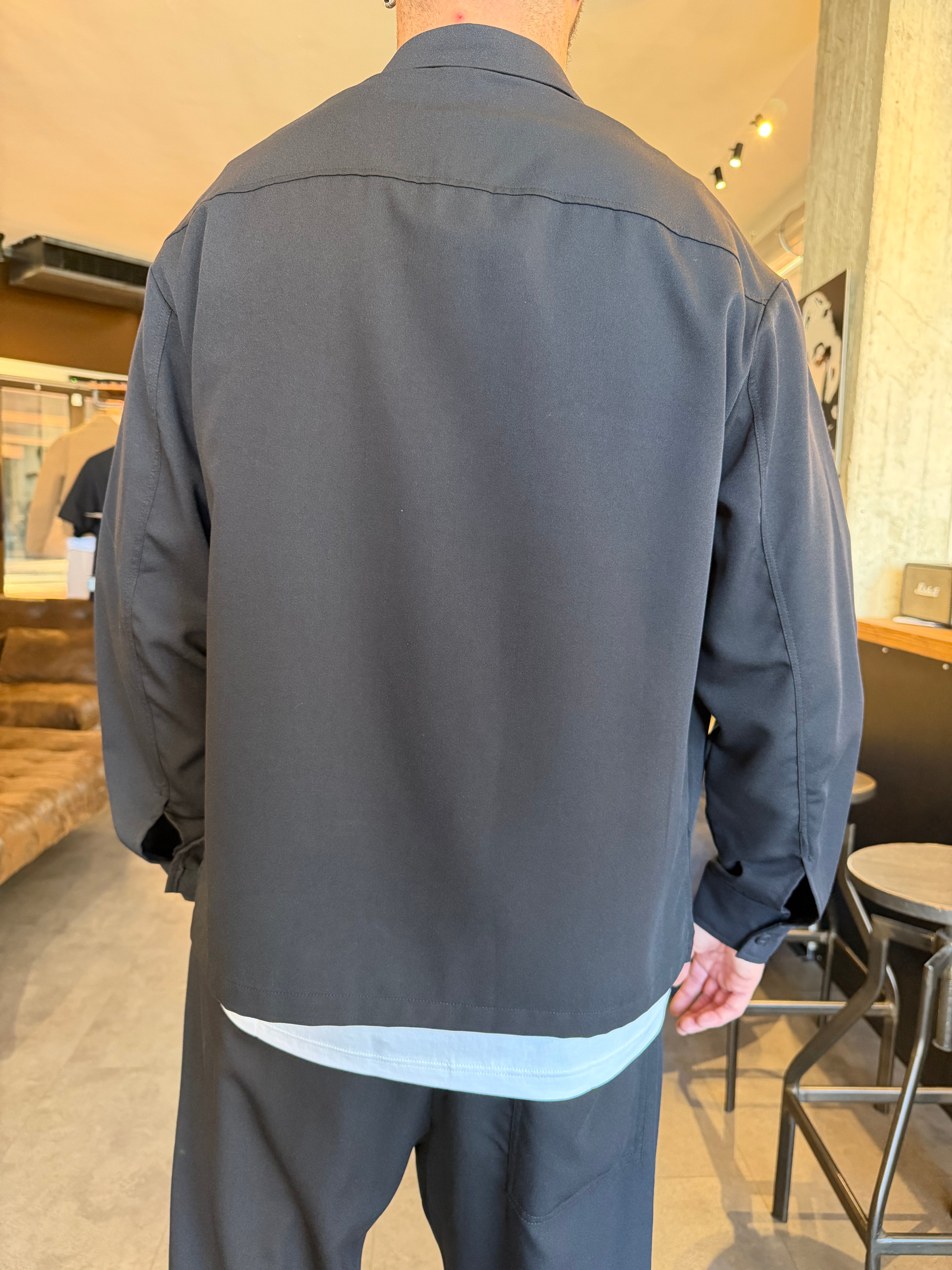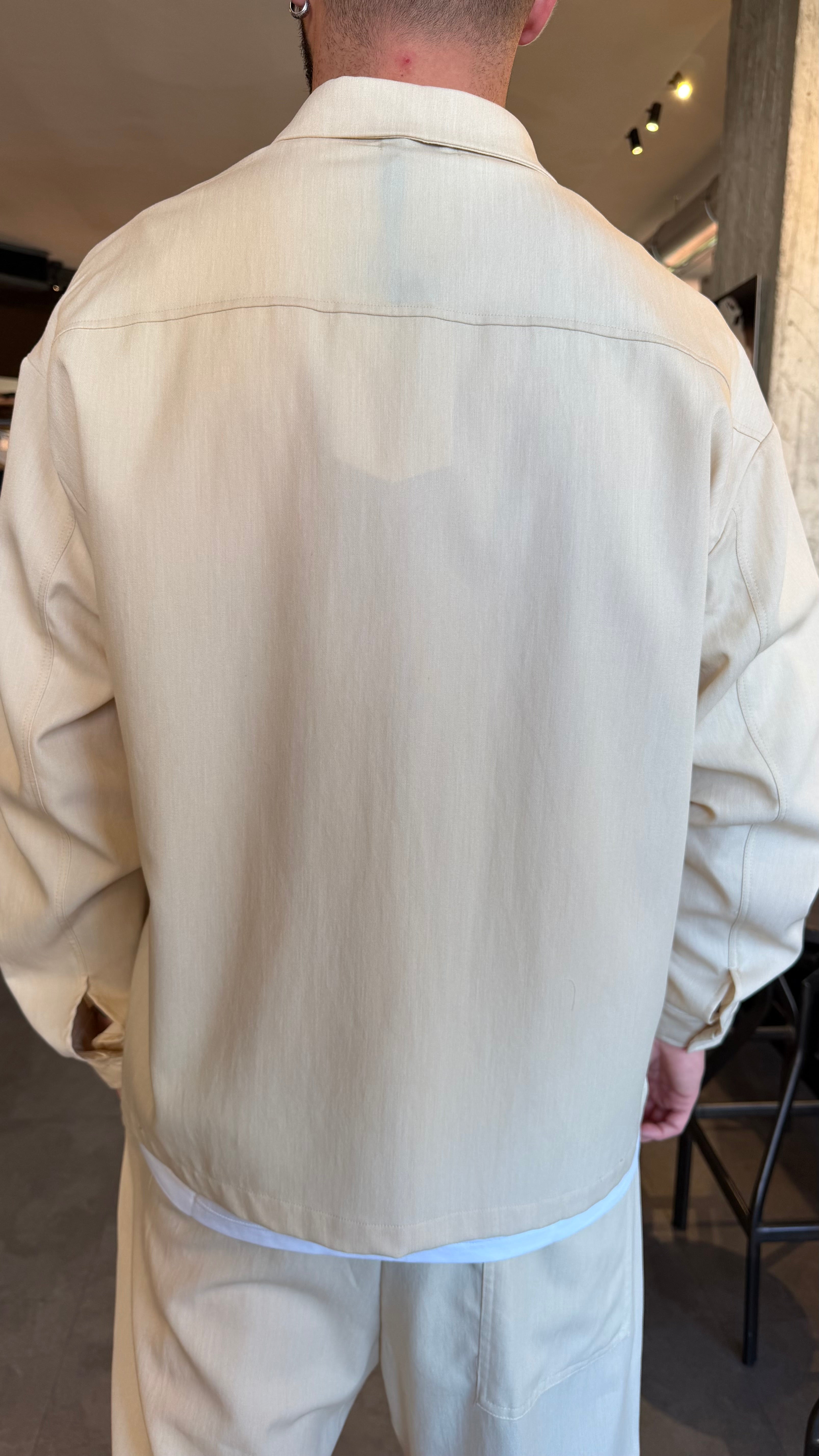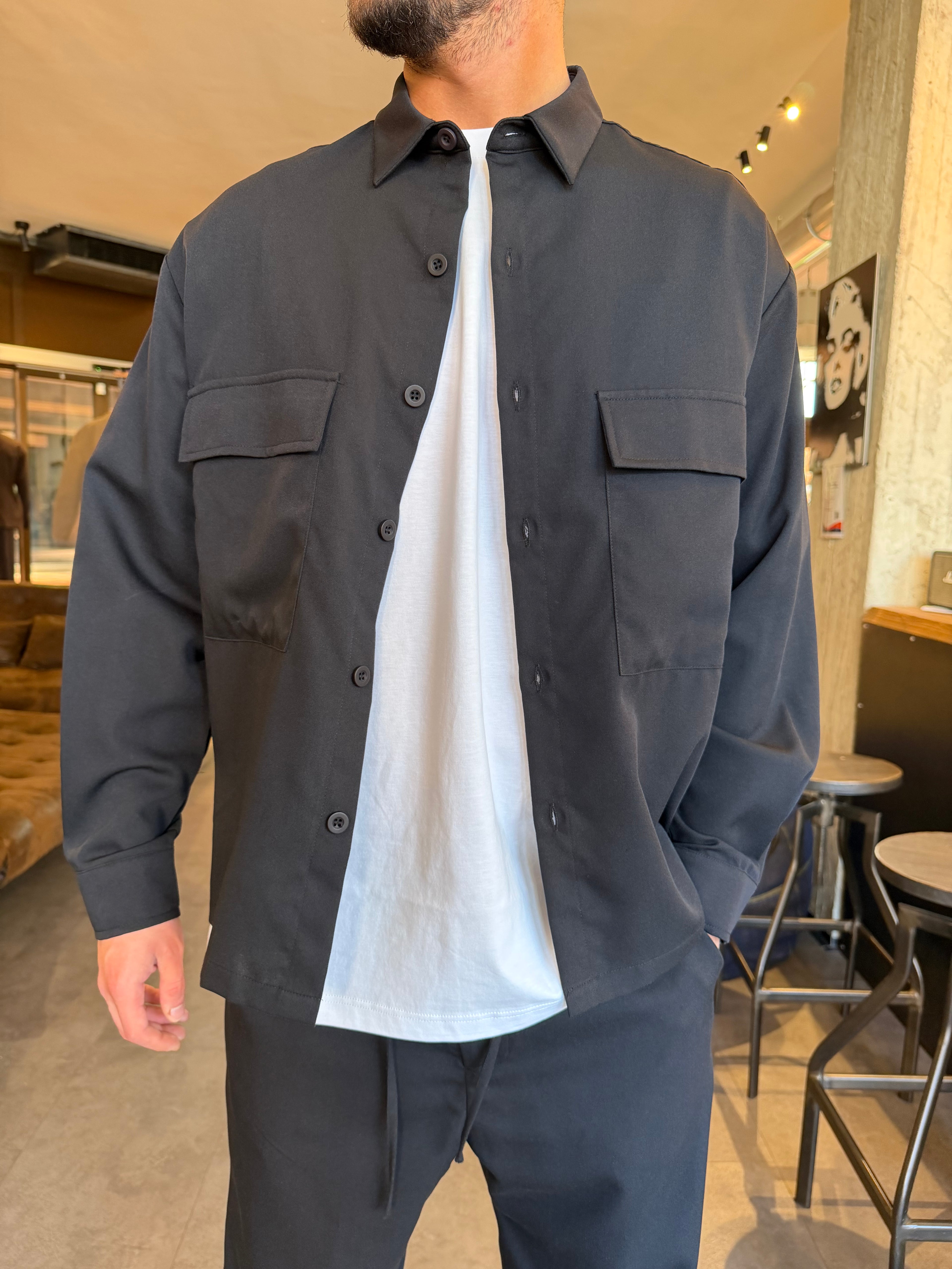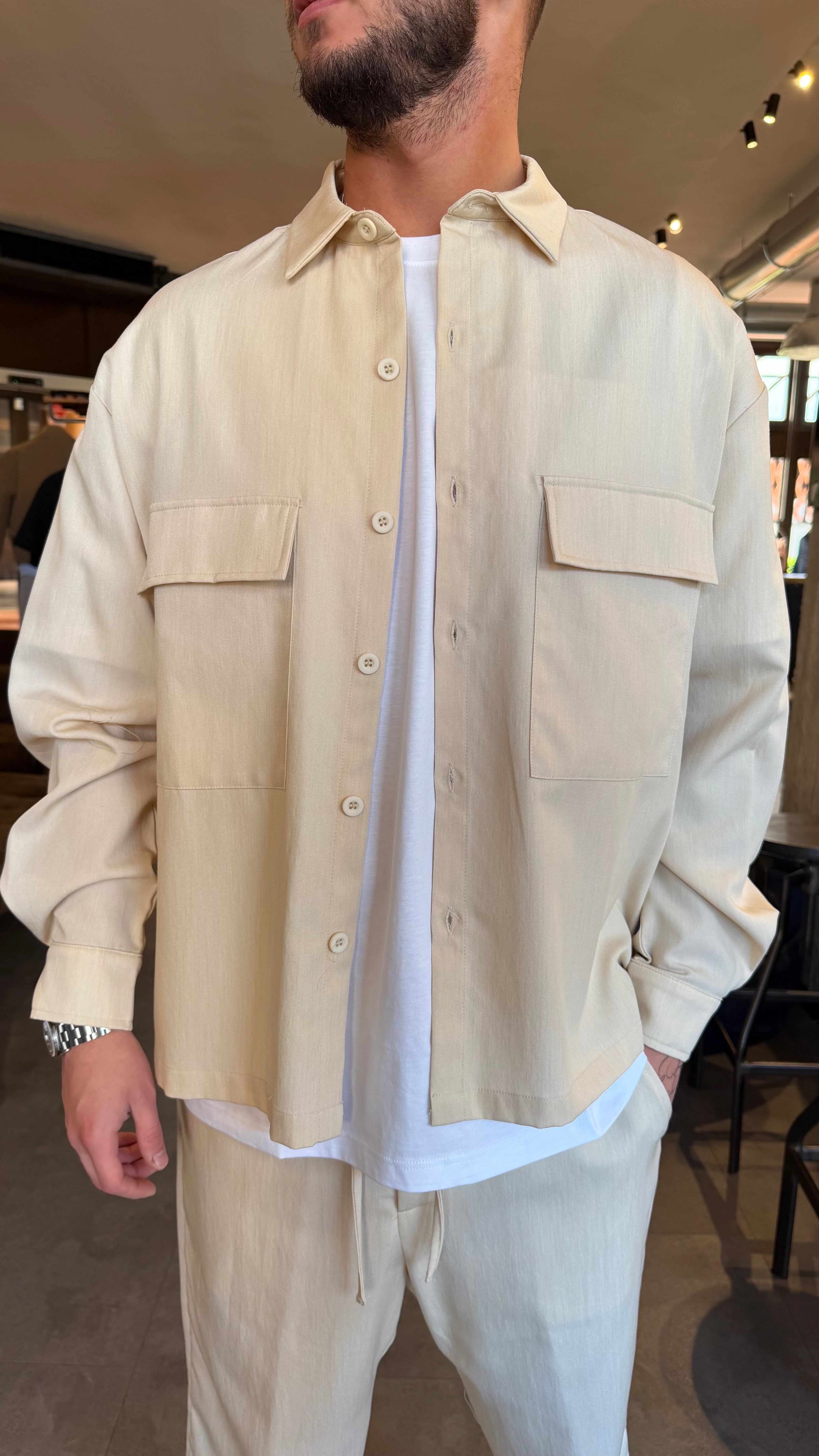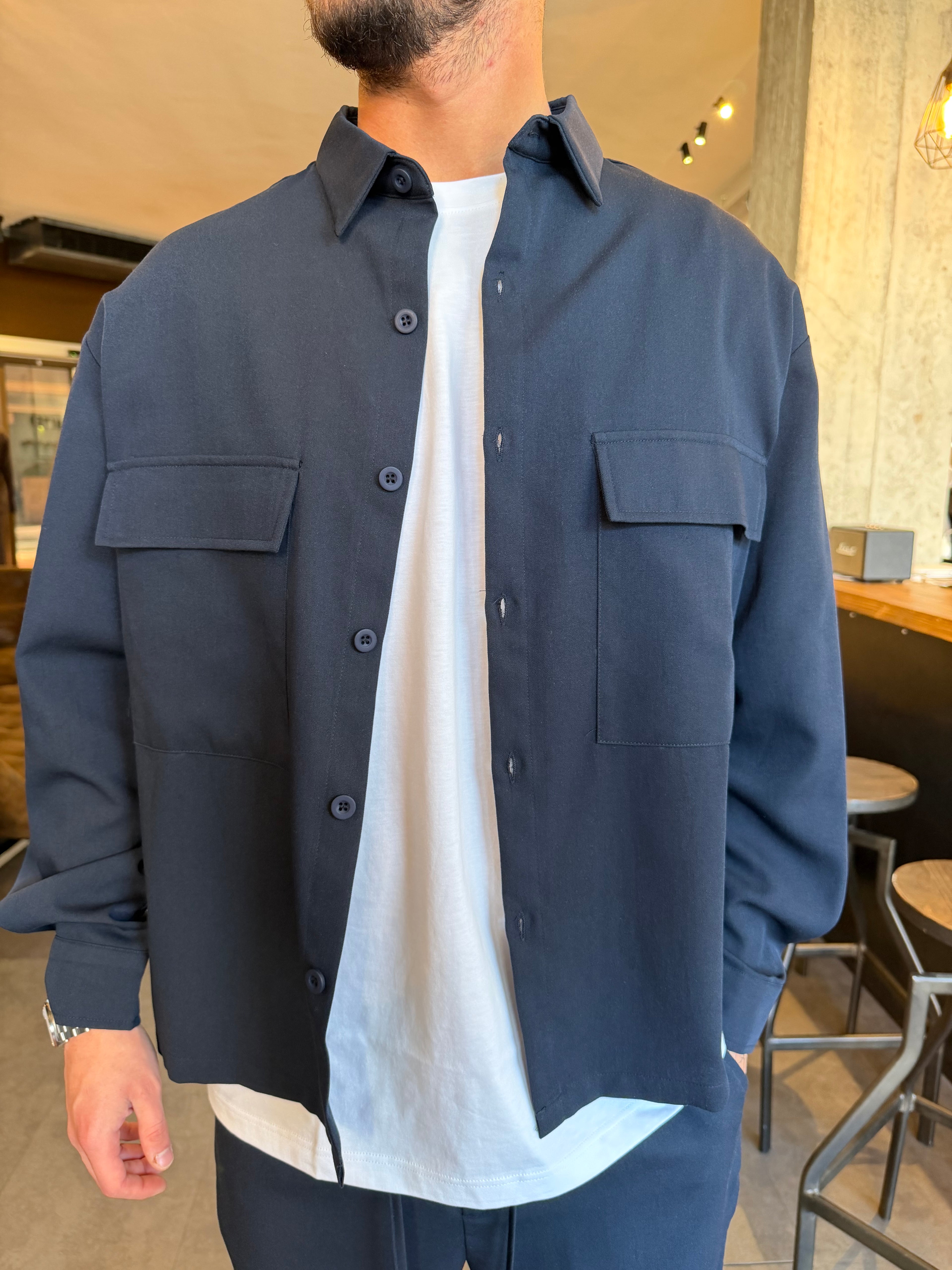 Camicione coordinato leggermente oversize con bottoni tono su tono e tasca a toppa davanti .