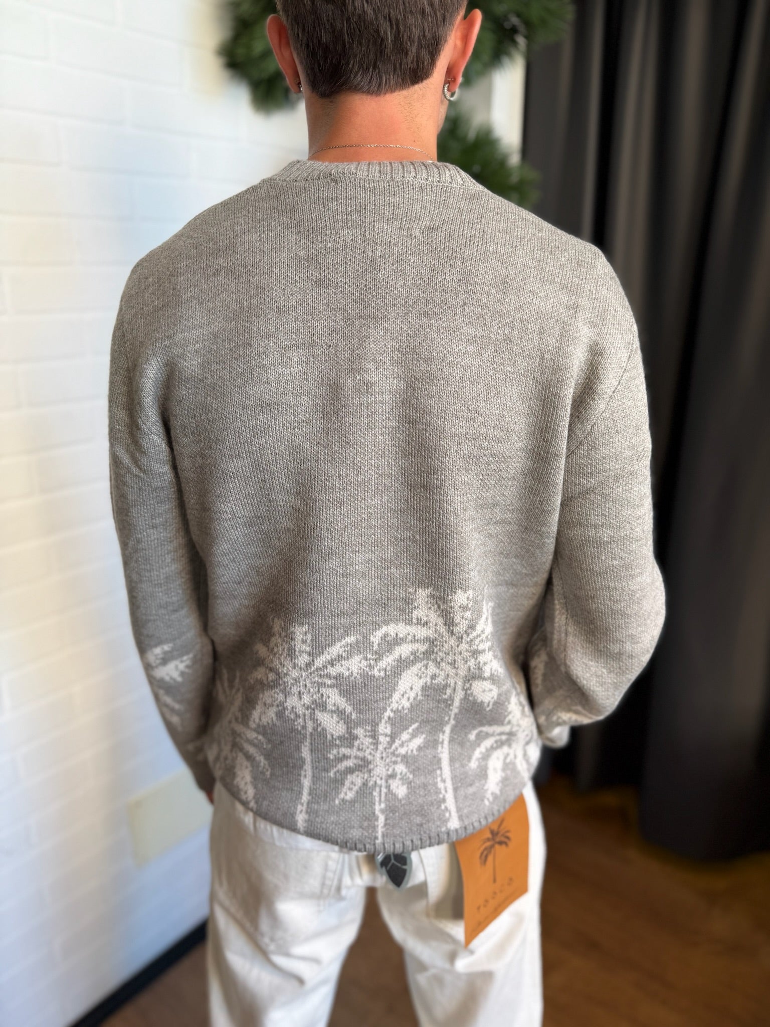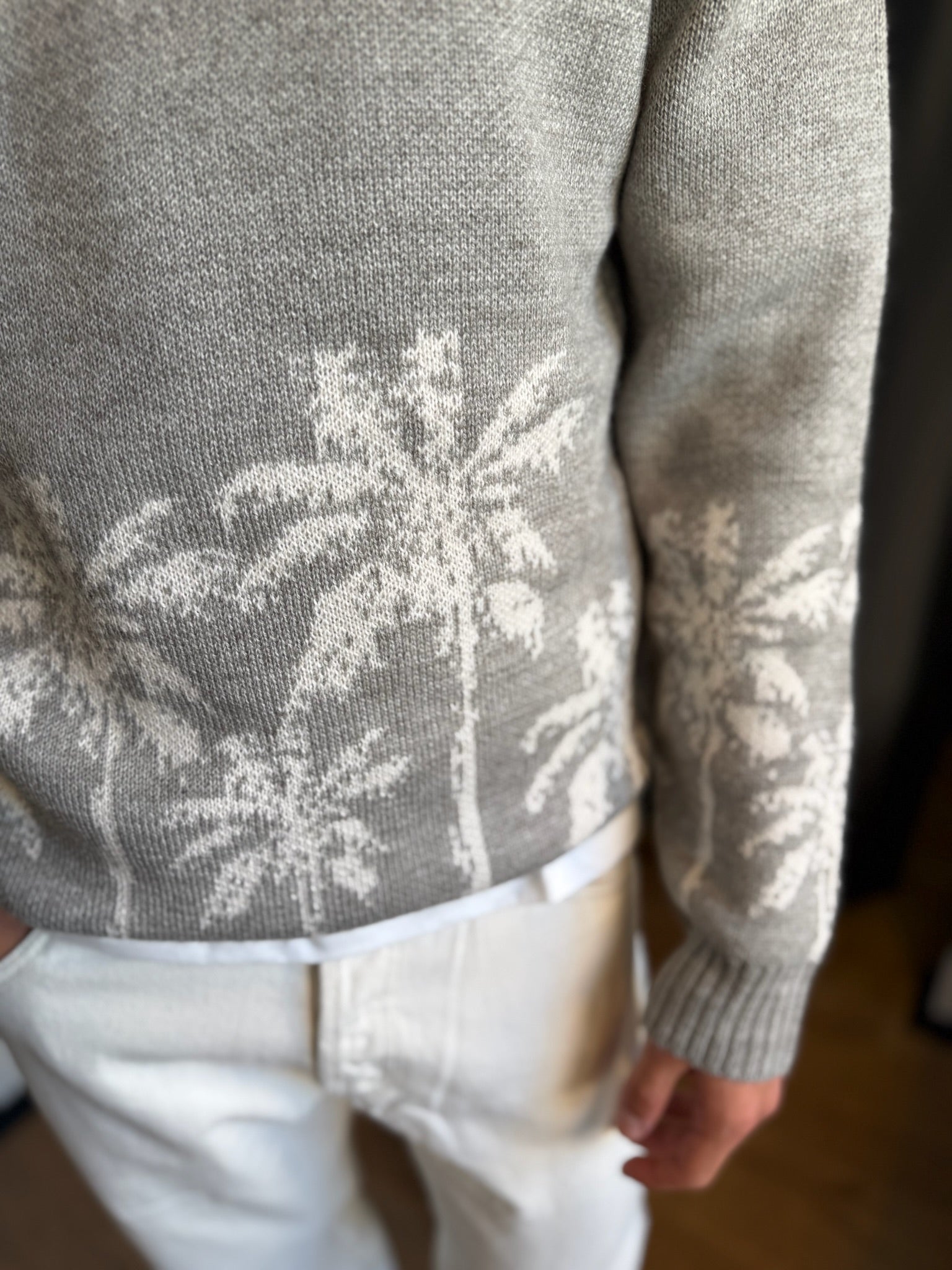 maglione grigio tooco, con colletto pronunciato e disegni
