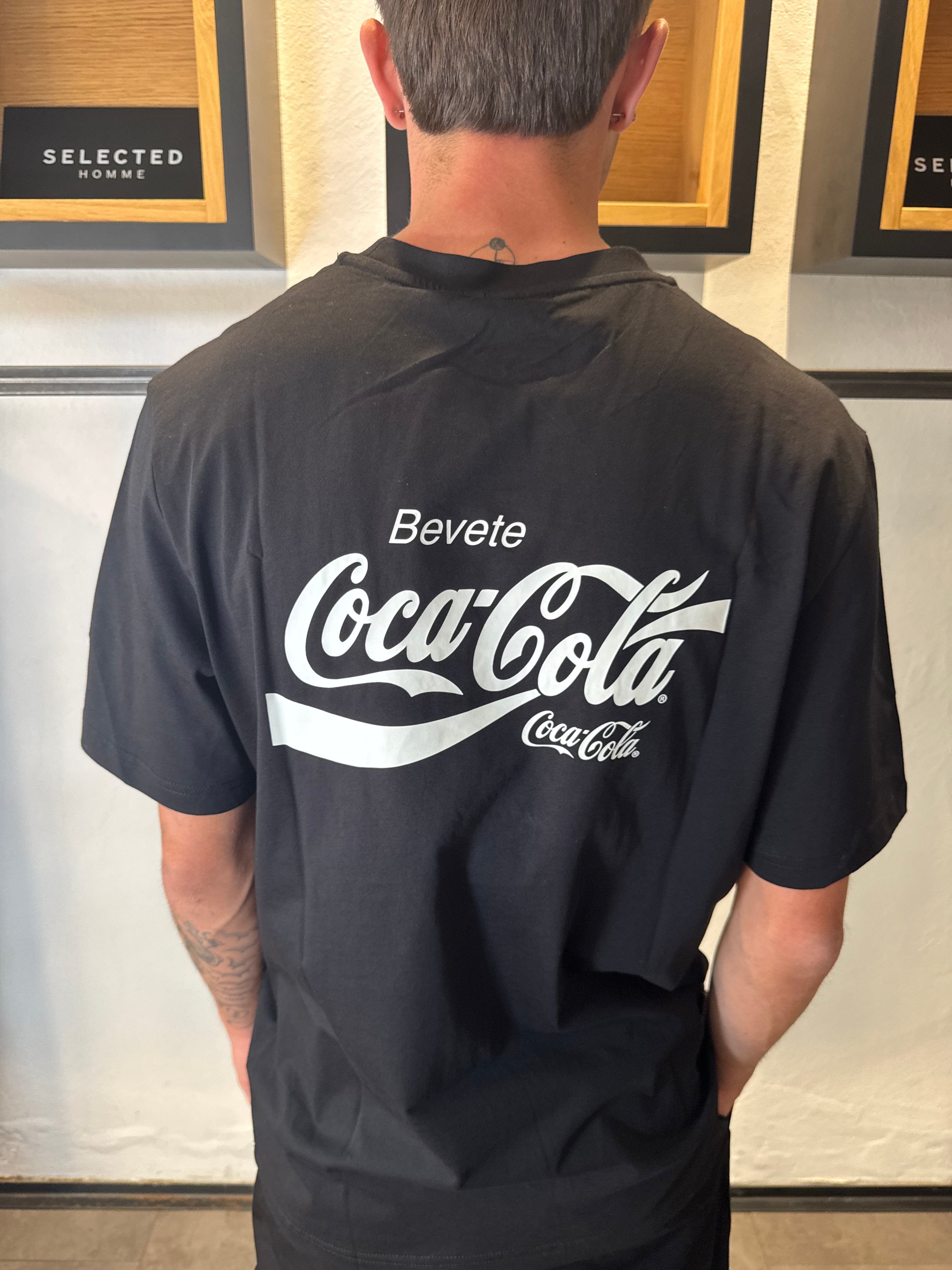 t-shirt coca cola morato, stampa in rilievo frontale, e retro.